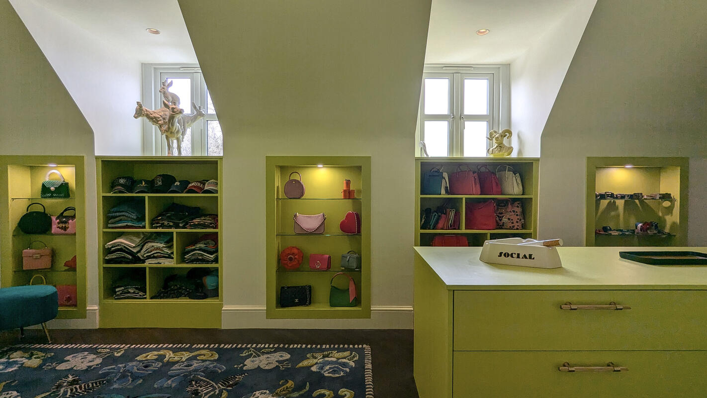 The centrepiece of this latest project is a breathtaking dressing room, finished in an eye-catching lime green. This vibrant choice, paired with gold handles, makes a striking statement, blending luxury with personality. The space is as practical as well as beautiful, featuring illuminated glass shelving units, ample drawer storage, and spacious wardrobes. A standout element is the smoked glass fitted wardrobe, specifically designed to showcase an enviable shoe collection. The result is a space that exudes both sophistication and playfulness, perfectly aligned with our client's unique taste.