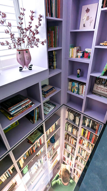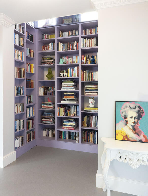 One of the most ambitious and awe-inspiring pieces we designed for this home is an 18ft-high lilac shelving unit that stretches across two floors, creating a dramatic "library" effect. This stunning structure incorporates a sleek glass platform, adding a contemporary touch to the traditional concept of a bookcase. Positioned in the hallway leading to the first floor, it acts as both a functional storage solution and a striking architectural feature. The combination of soft lilac and transparent glass lends an ethereal quality to the space, enhancing the grandeur of the home while maintaining a sense of warmth and individuality.