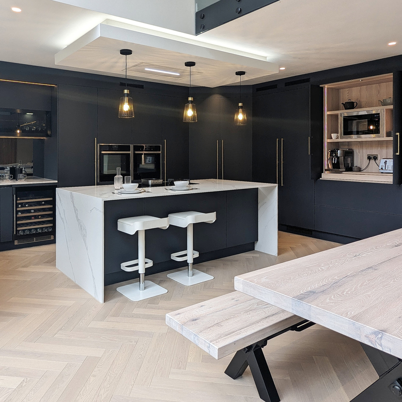 The true beauty of full-height kitchen cabinets lies in their flexibility. From concealed breakfast cupboards and drinks bars to integrated utility zones and coffee stations, the internal configuration can be entirely tailored to your lifestyle.