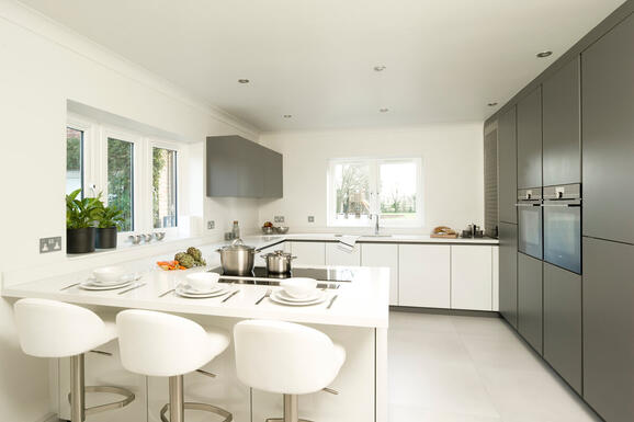 We are extremely proud of the results of this modern transformation. The new kitchen features our Urban Style handleless tall and wall units in Matt Lava Grey matched with Brilliant White gloss base units from the same range. The seating area has been integrated into the peninsular kitchen island with a breakfast bar on one side to provide the perfect view of the cooking action. The addition of a down draft extractor provides uninterrupted clean lines to enhance the modern aesthetic and create a fantastic entertaining space.