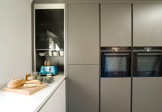 Another feature included in this kitchen is the tambour/roller shutter unit. This hidden storage solution is perfect to conceal small appliances and maintain the sleek look of the modern kitchen. A socket can be placed inside the unit so that appliances don’t have to be moved far when in use. Available in a variety of materials this example has been finished with black tinted glass.