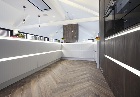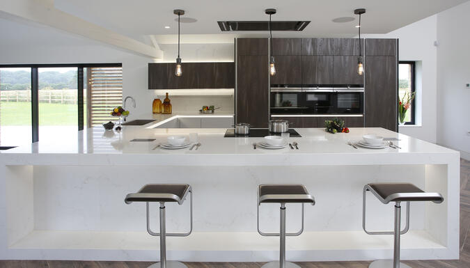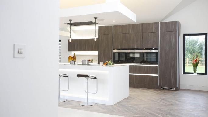 The three contemporary new homes feature Urban Life handleless kitchens in Light Carbon Yosemite for the tall and wall units with Urban Life Supermatt Light Grey for the base units with Quartz stone worktops and upstands in Carrara Misterio..