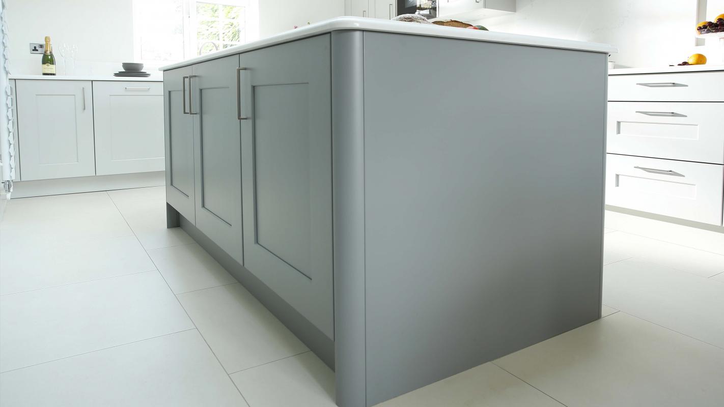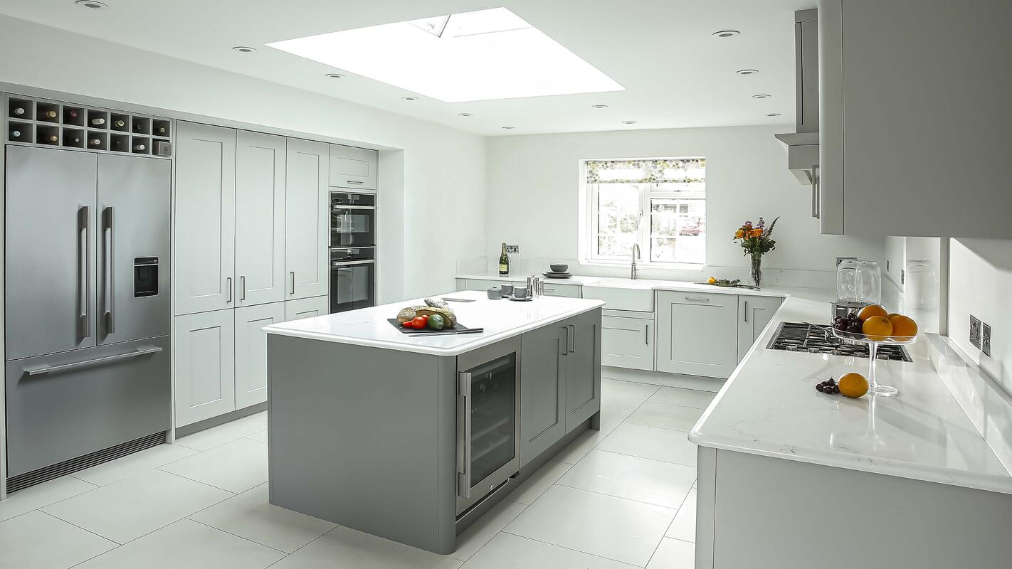 A feature of this Shaker door is the totally smooth finish, the five piece timber door exudes a refined elegance which is enhanced by the choice of a contrasting colour for the statement island in Stepping Stone Grey.