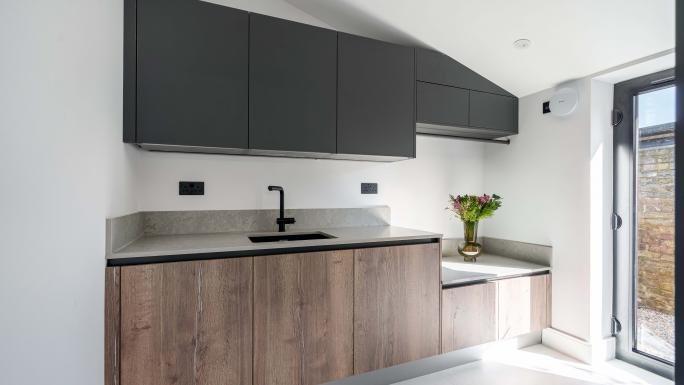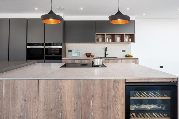 The finish complements the decor of the building perfectly with our handleless Graphite tall units and Halifax Pewter Oak base units. A lovely additional feature is the open shelving at one end, a place for the homeowner to inject their own personality and show off their favourite objects.