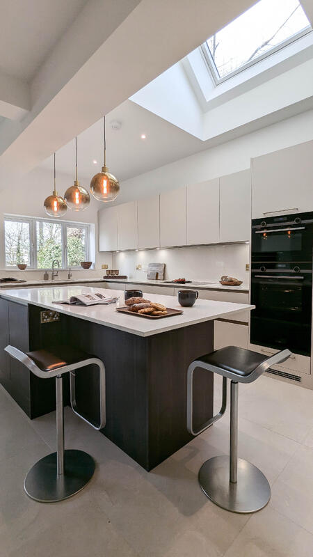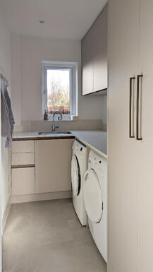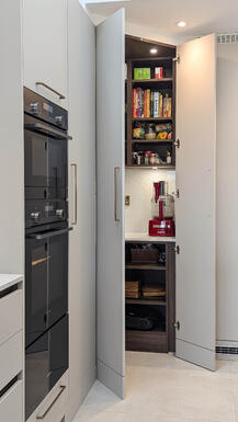 One of the most sought-after features of this kitchen is the walk-in pantry, designed to meet the needs of a keen cook. The client wanted a dedicated space to store small appliances, allowing them to remain plugged in and ready to use rather than being tucked away in low cupboards. This highly practical addition enhances the efficiency of the kitchen, keeping work surfaces clutter-free while ensuring all essential appliances are within reach.
