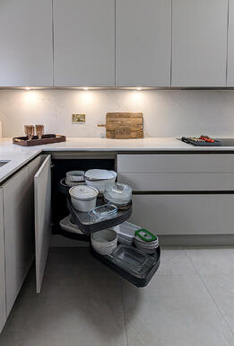Storage was a key priority in this project, and no inch of space has been wasted. The kitchen is packed with thoughtfully designed storage solutions, including deep pan drawers, a Le Mans corner unit, and integrated island cupboards, ensuring that everything has its place and is easily accessible.