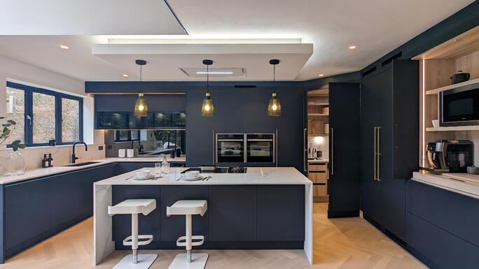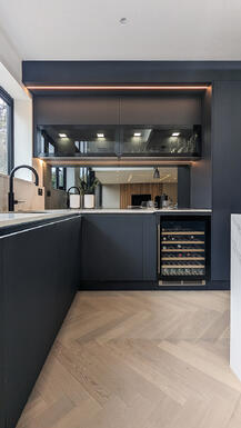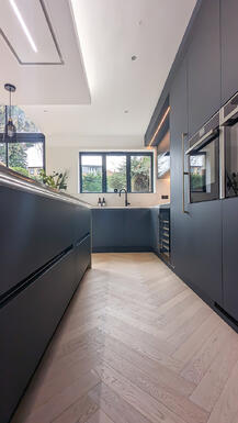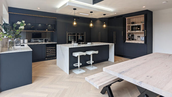 A bespoke family kitchen packed full of storage features whilst keeping the design calm and sophisticated.