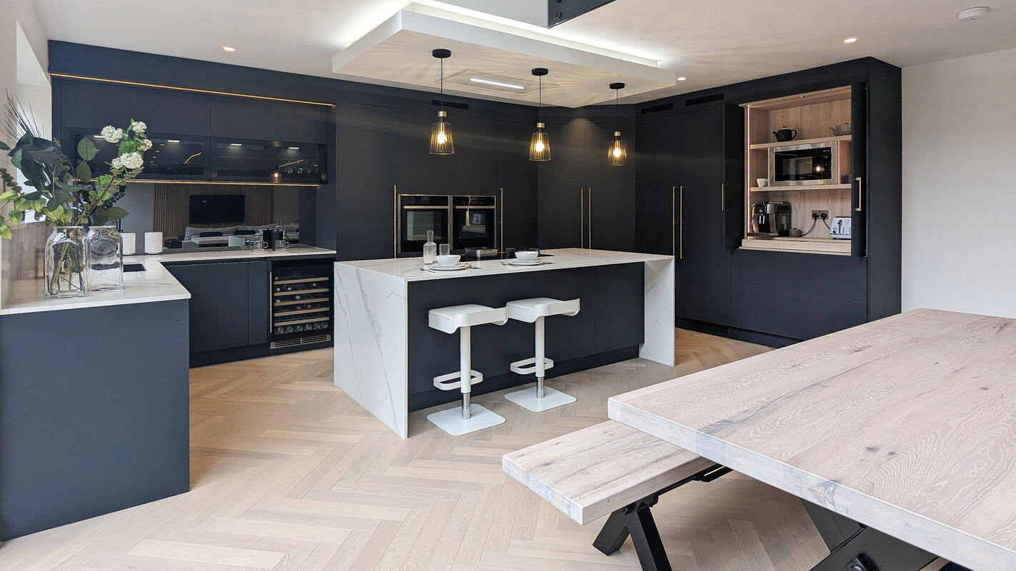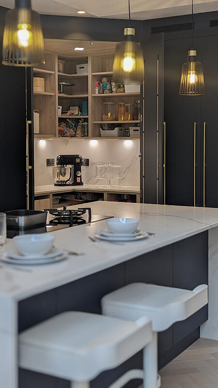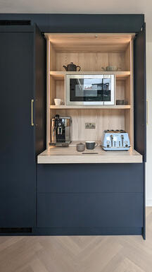 Firstly there is the pocket door larder with pull out shelf, perfect to create a breakfast or coffee station for those busy mornings so everything is easily accessible and neatly closed away when not in use.