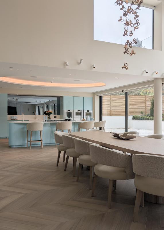 A pocket door cocktail cabinet adds a layer of understated luxury, revealing a dedicated space for entertaining when opened, and disappearing neatly when not in use. This balance of elegance and innovation is further complemented by the expansive glazing, which floods the kitchen with natural light and connects it seamlessly to the outdoor space.