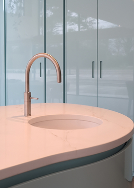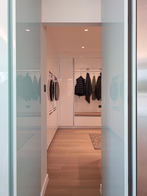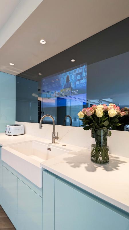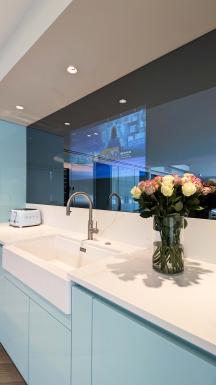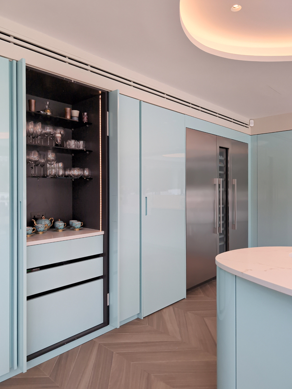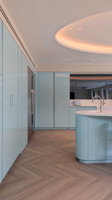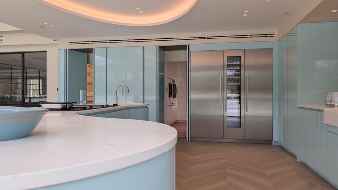 The layout has been thoughtfully designed to maintain a clean, uninterrupted aesthetic, with handleless cabinetry and integrated appliances seamlessly blending into the architecture. Premium Gaggenau appliances are thoughtfully incorporated, delivering professional-level performance while maintaining the kitchen’s sleek, minimalist appearance.