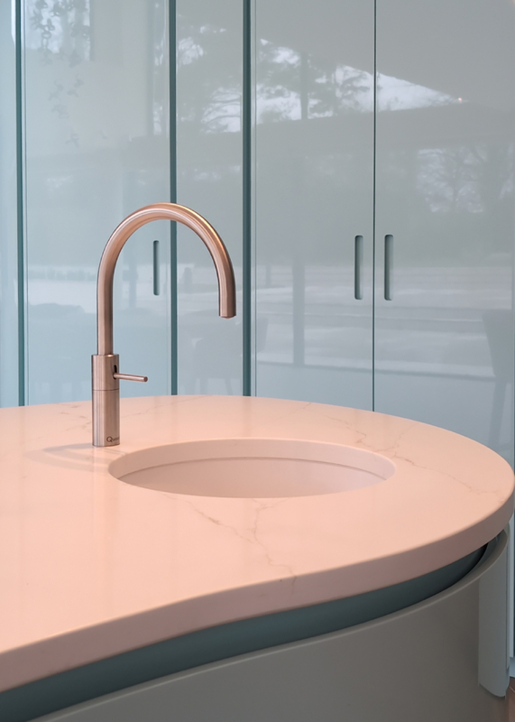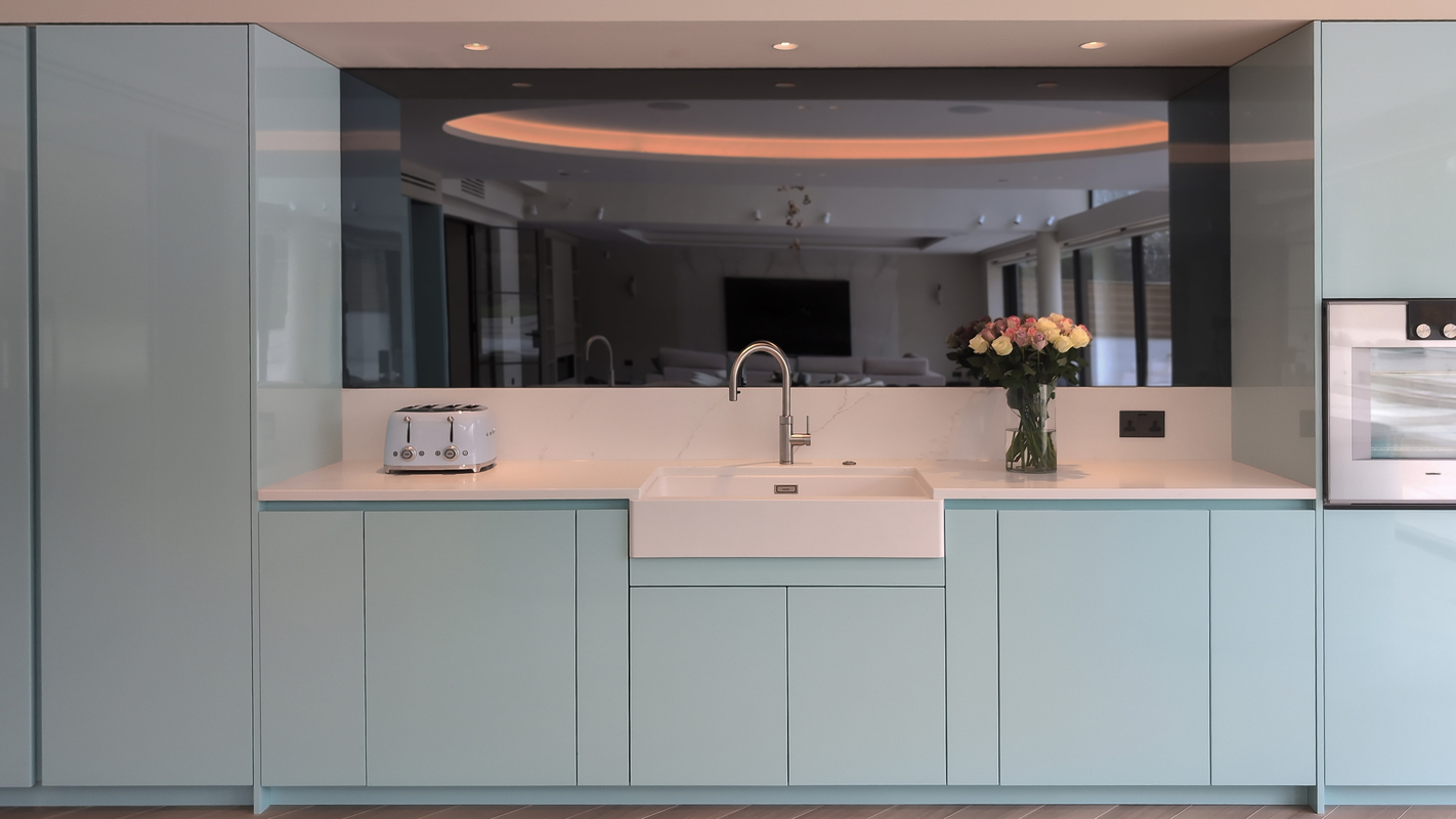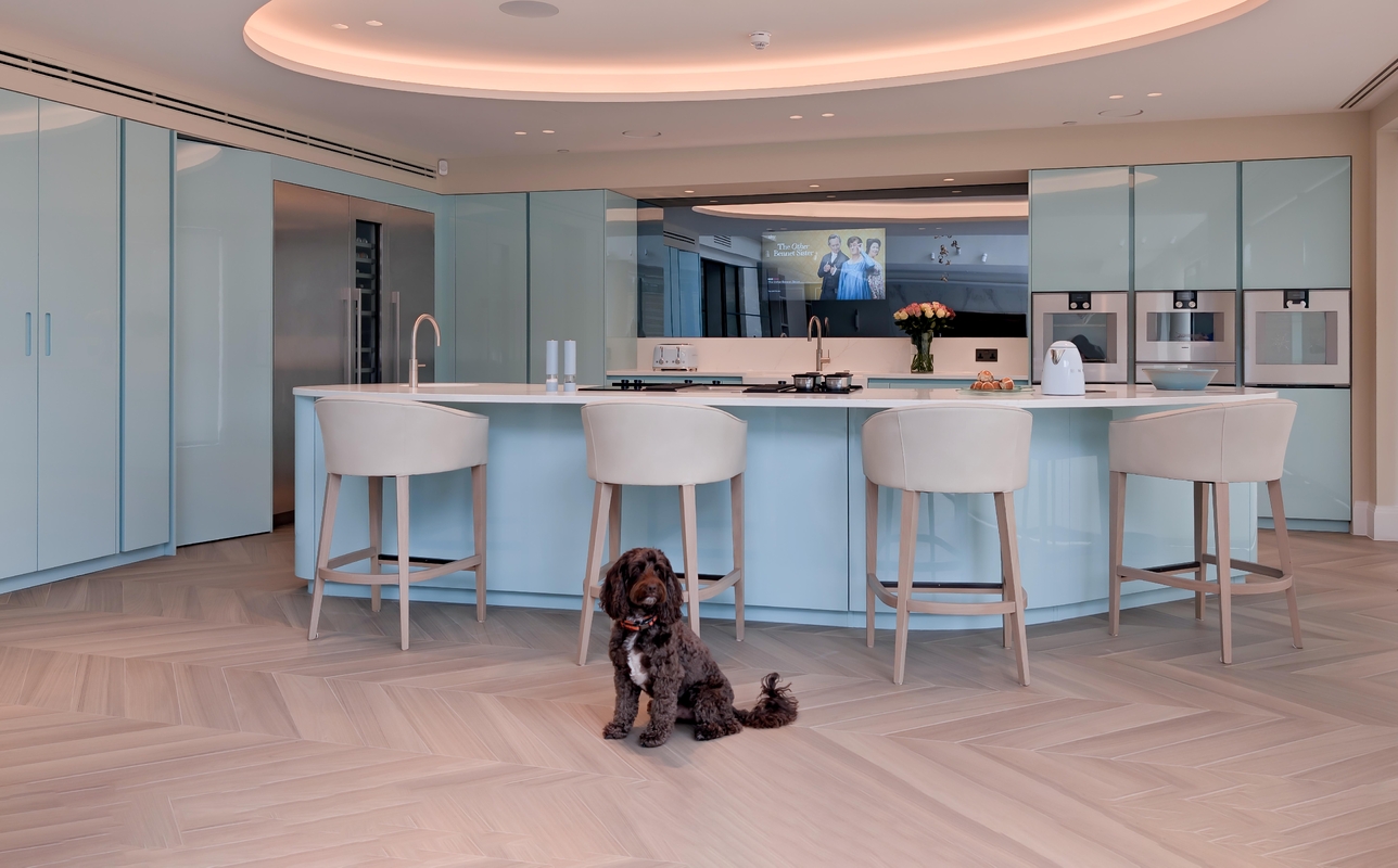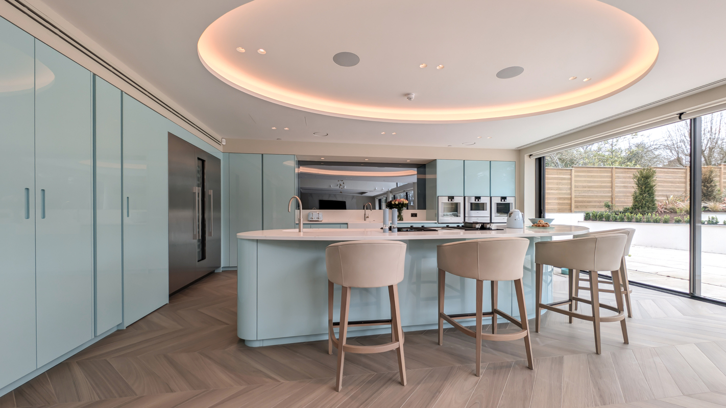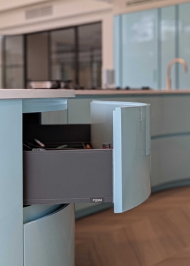 This striking Italian kitchen by Urban Myth showcases the refined design language of Pedini, centred around its signature curved island. Soft, flowing lines define the space, with the island acting as both a functional hub and a sculptural focal point. Finished in a serene, high-gloss Mint Blue, it reflects light beautifully, enhancing the sense of openness and calm throughout the room.