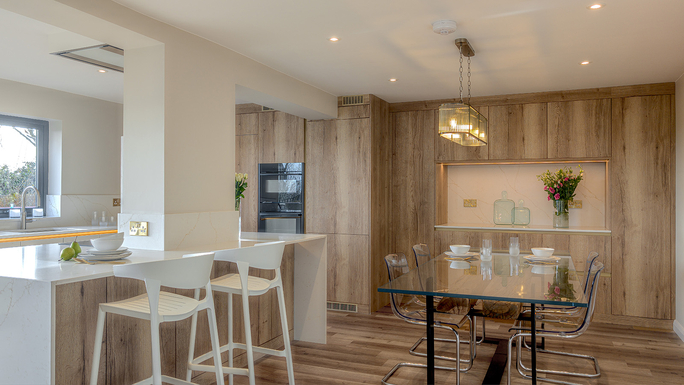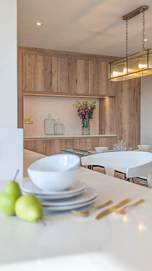 Discover a family kitchen design in Natural Halifax Oak cabinetry, grey base units and personalised details