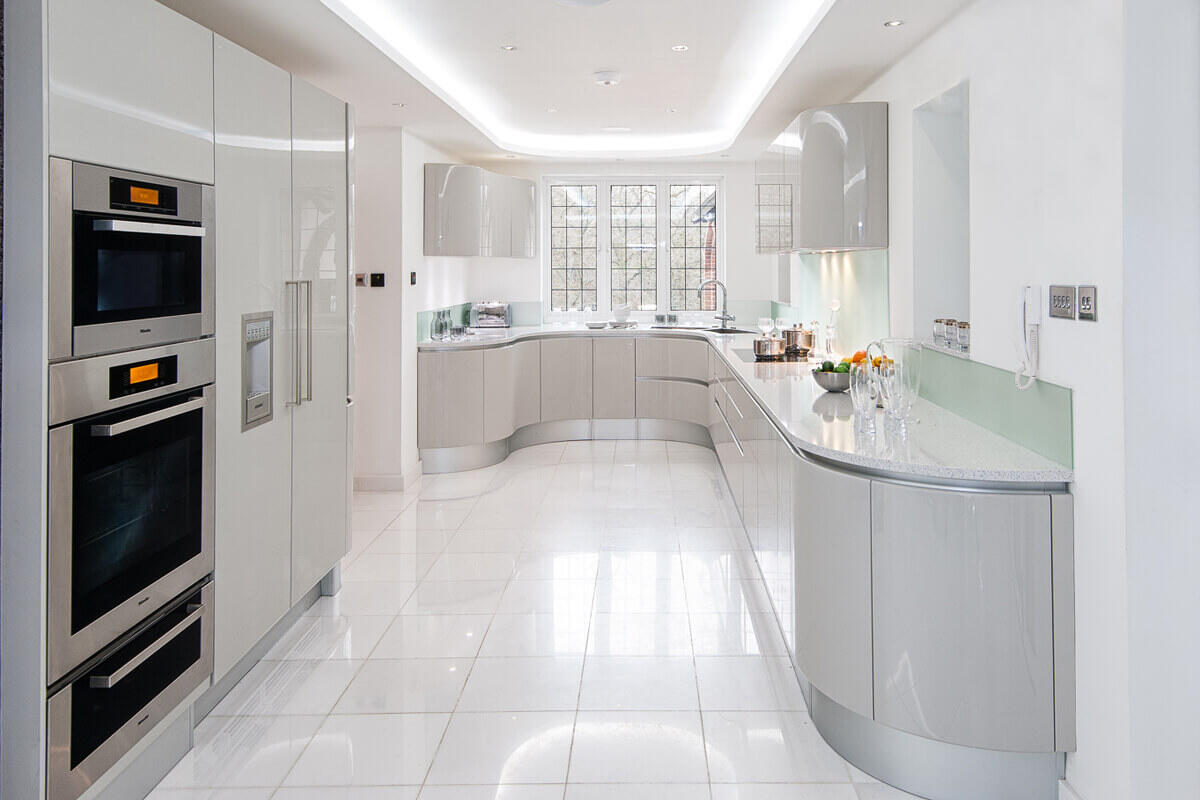 Even with a narrow galley kitchen the curved Pedini Artika units are impressive and actually create a feeling of space. The tall units house the ovens and integrated fridge freezer and still leave plenty of room for storage.