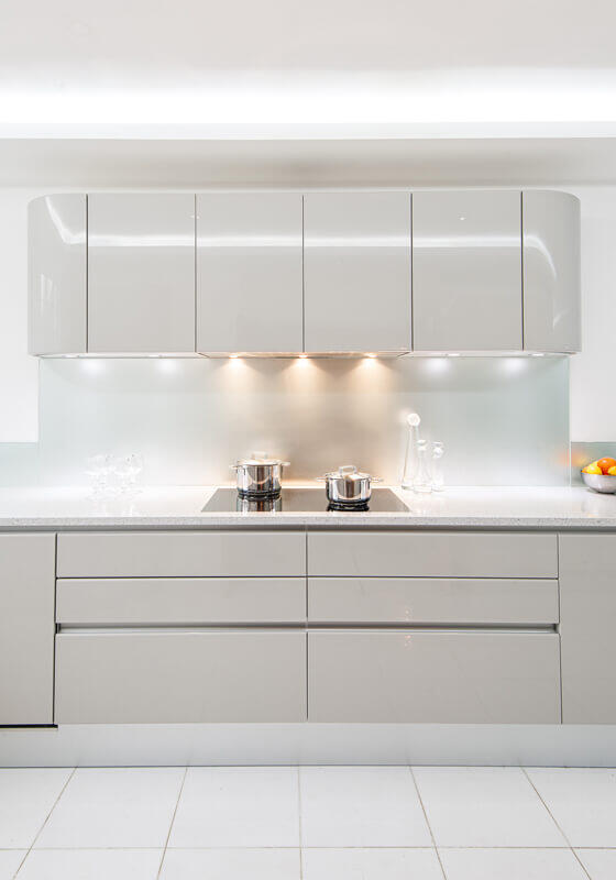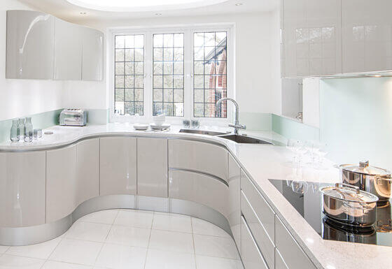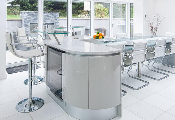 The curved design of this Pedini kitchen make the most of this L shaped kitchen dining room. The Artika collection in grey and silver gloss lacquer are impressive.