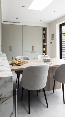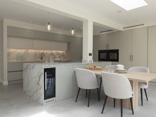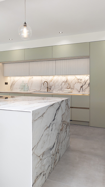 This open-plan kitchen and dining area is a masterclass in understated elegance. Clean architectural lines, a muted palette and luxurious materials combine to create a calming and cohesive space. Soft sage cabinetry pairs beautifully with bold veined surfaces, giving a subtle nod to natural elements.