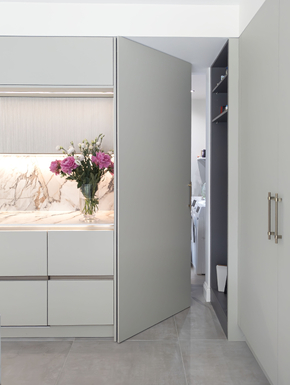 Sleek cabinetry with brushed bronze handles hide an abundance of storage, keeping clutter out of sight and surfaces beautifully clear. A dedicated breakfast pantry, keeps the morning rush efficient and tidy, and underlit glass shelves down one side provide a place for photos and decorative objects to add that personal touch. A secret door, cleverly concealed within the cabinetry, leads to a hidden utility room maintaining the clean lines and calm atmosphere of the main space.