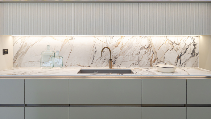 Fluted panelled doors add interest to the upper cabinetry and island, while integrated lighting beneath cabinets makes the marble surfaces glow and enhances the overall ambience of the space.