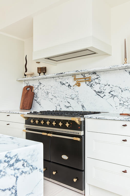 Urban Myth recently completed a bespoke kitchen design for an architecture-designed home nestled in the vibrant neighborhood of North Kensington. The focal point of this exquisite kitchen is a stunning Arabescato marble worktop, creating a luxurious and sophisticated ambiance. Complementing this statement piece is the use of Farrow & Ball's timeless School House White paint for the Shaker-style kitchen cabinets, adding a touch of elegance and timelessness to the space.
