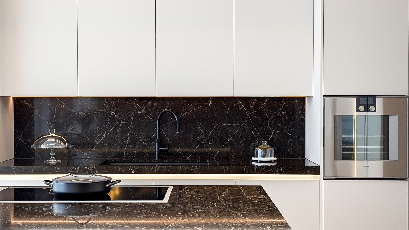 Cabinets take centre stage, and their finish can be your anchor point. Popular options like matt white or light grey offer versatility and longevity, while dark navy, black, or stained wood tones introduce richness and depth. Don’t be afraid to step away from the neutrals, bolder shades can add personality without compromising sophistication.