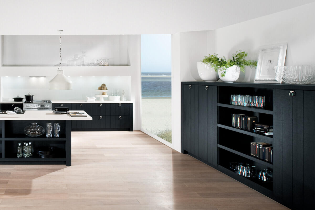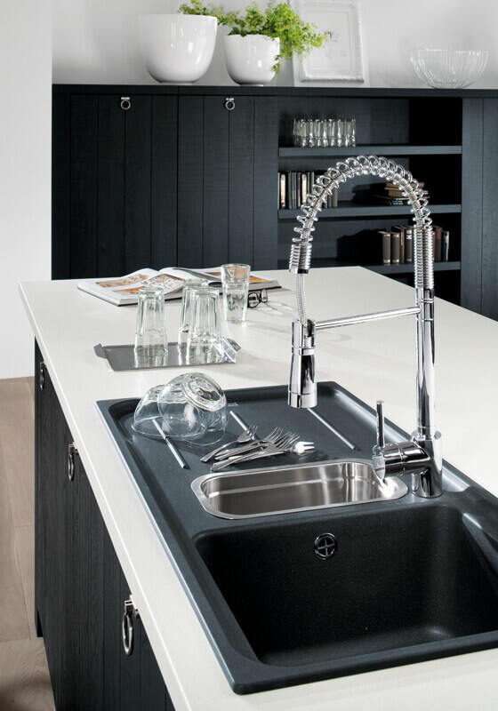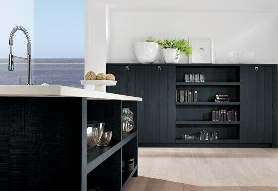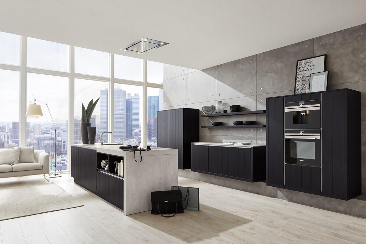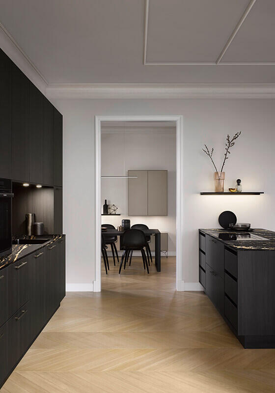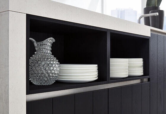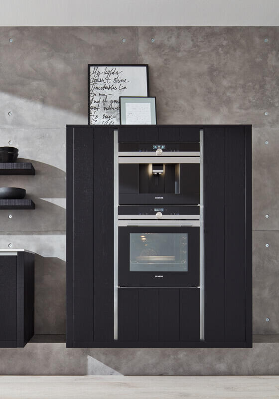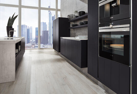 The statement worktop and backsplash really stand out against the moody Black Fine oak cabinets in this kitchen. The industrial style metallic handles add another layer of texture to complete the look.