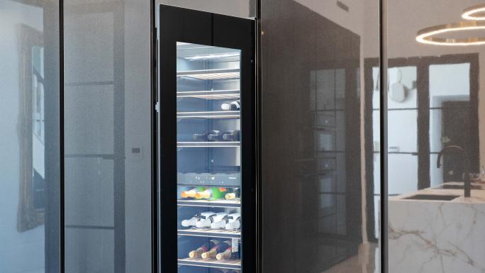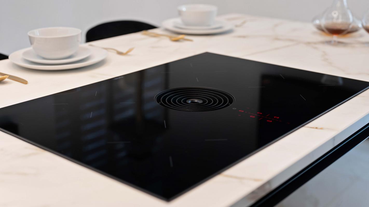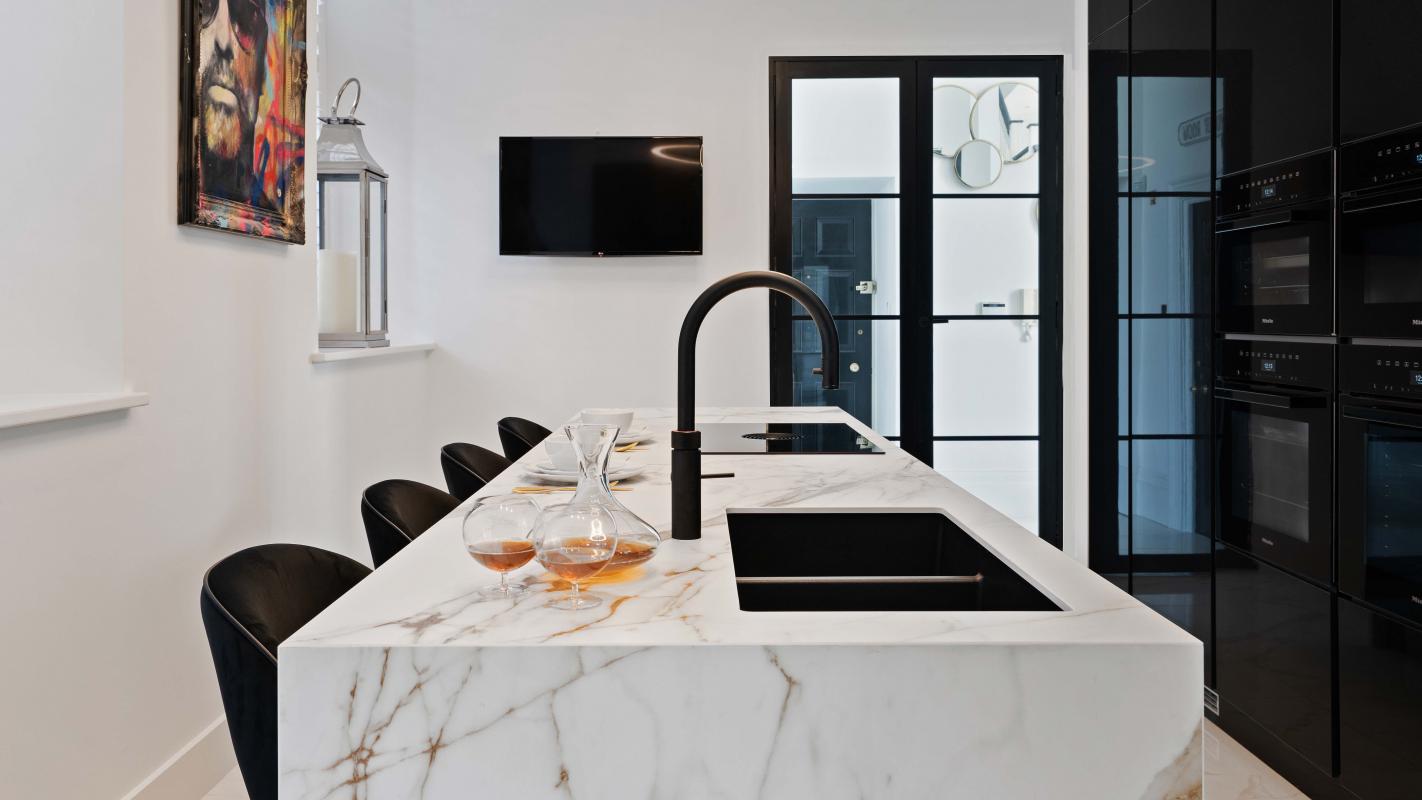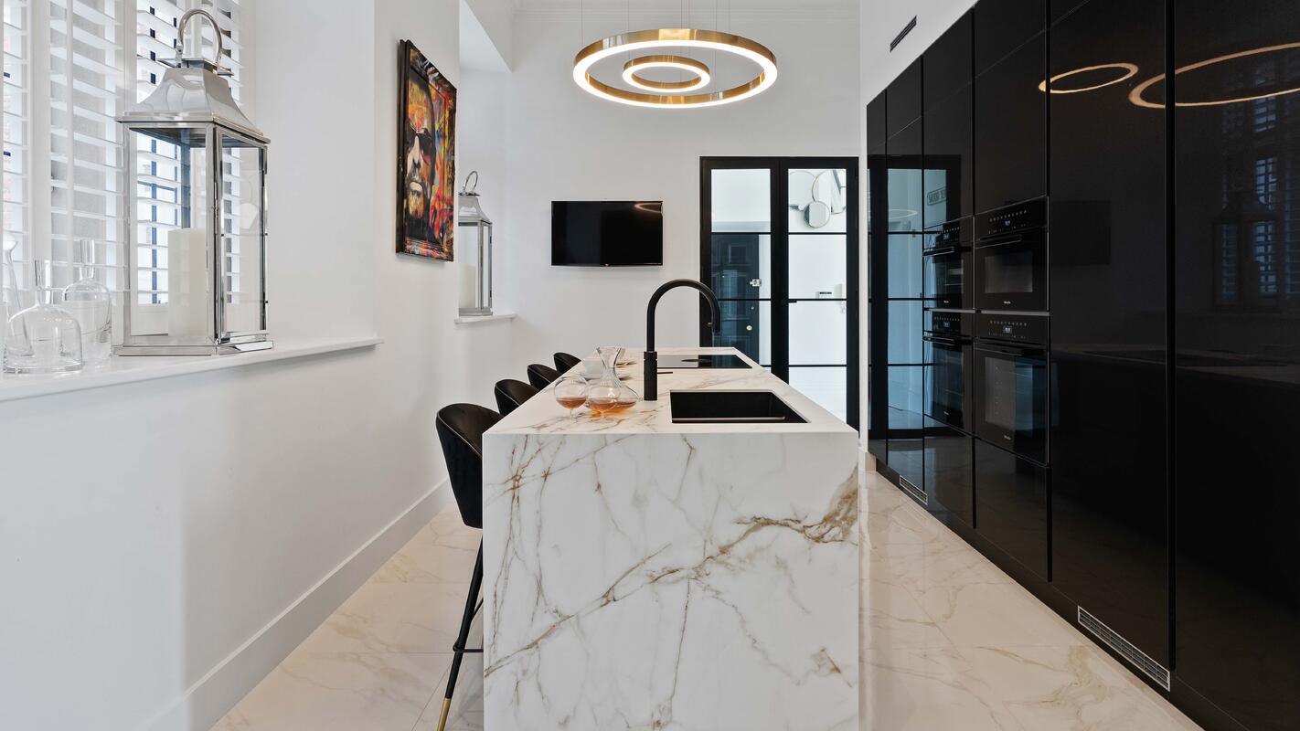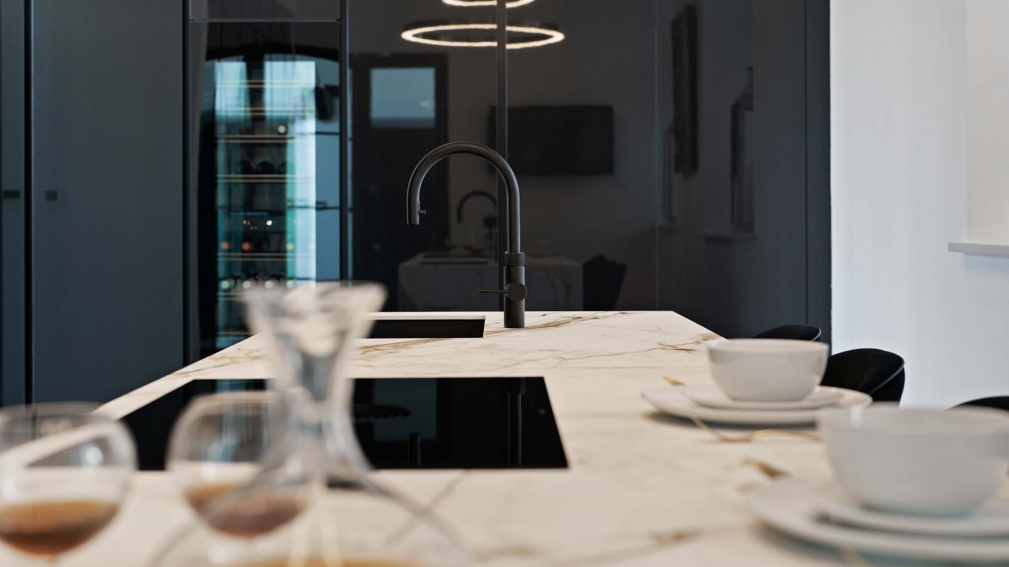 With such high ceilings the only option for this kitchen was a downdraft extractor within the hob and this Bora Pure model fits in perfectly with its luxurious surroundings. The star feature of the kitchen is the sintered stone island in Calcatta Gold, matched perfectly to the stone tiles our client had already ordered before designing the kitchen.