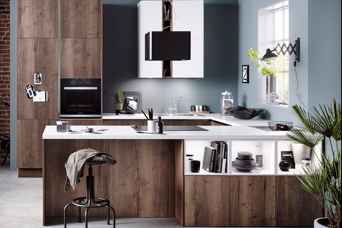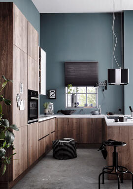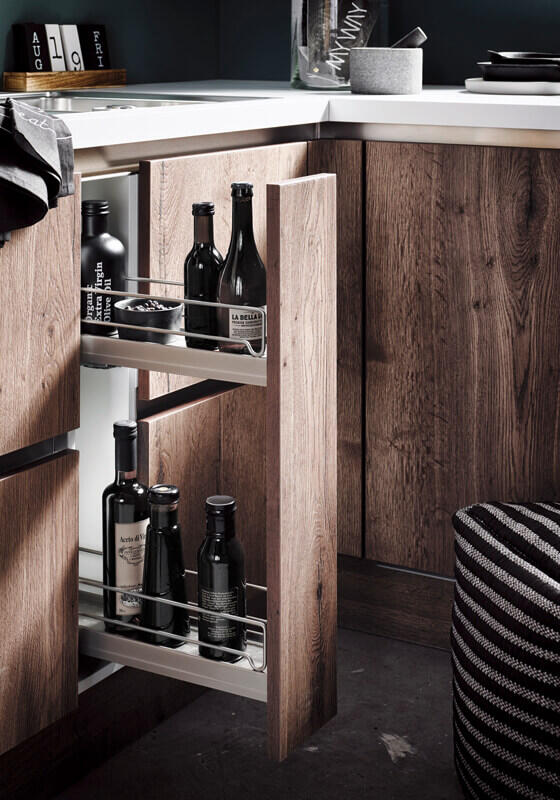 The Natural finish to these Cognac Vintage Oak veneer units is reminiscent of a rustic farmhouse. However, the handle-less cabinets instantly add a contemporary touch.