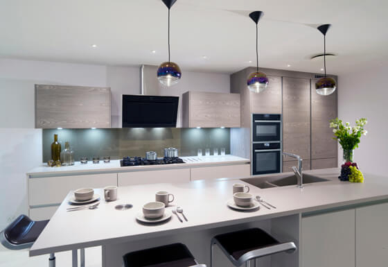 The Supermatt finish of this Cashmere kitchen gives a welcoming and sophisticated feel to the space. Combined with the French Grey horizontal grain veneer doors the look is brought right up to date, as it's all about mixing materials for added texture and interest.