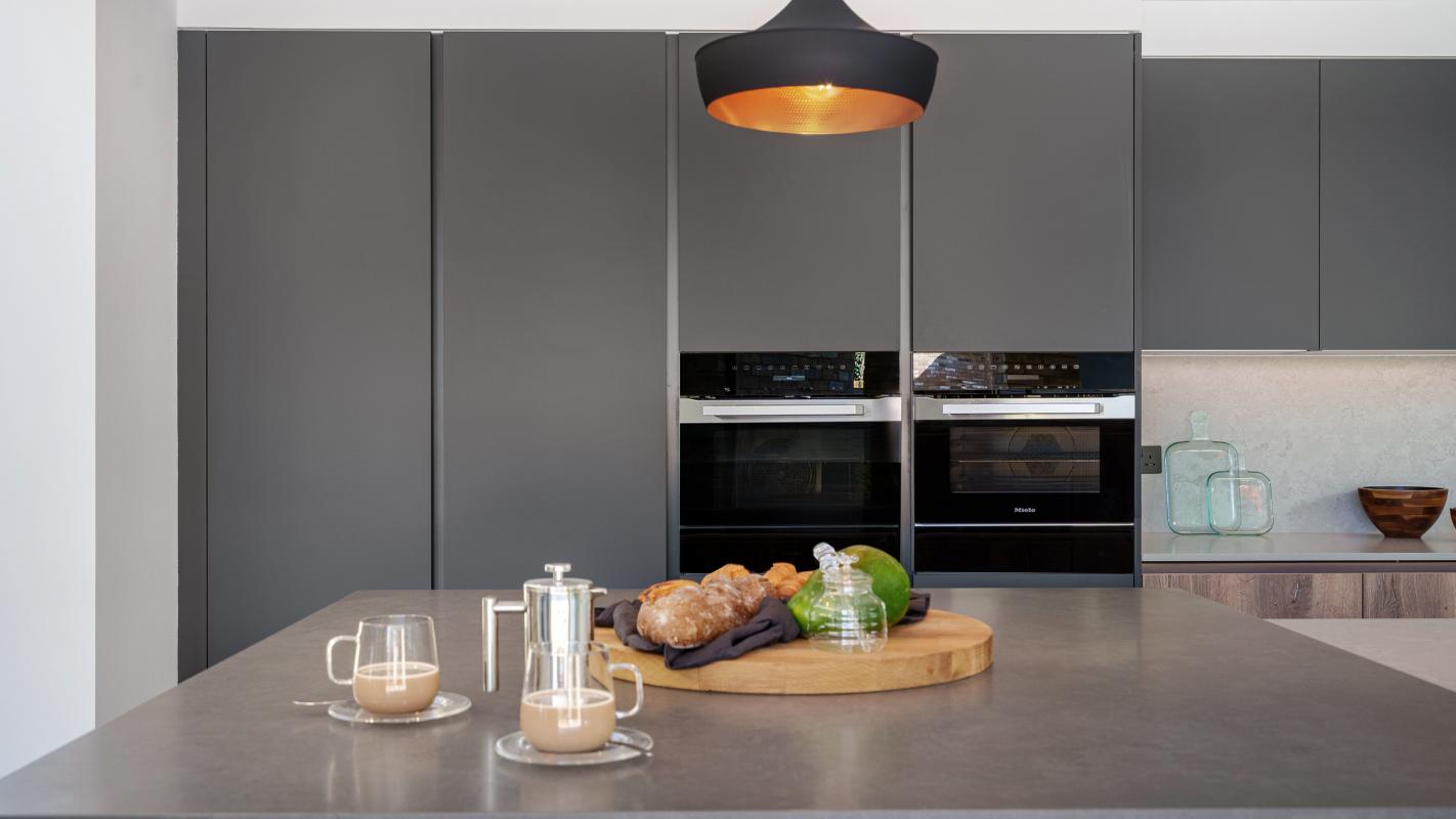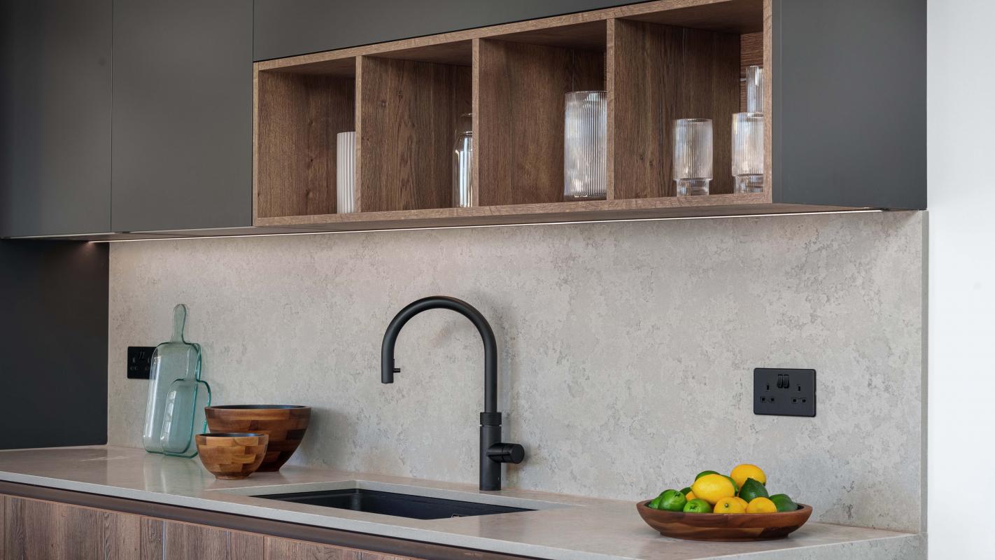 The finish complements the decor of the building perfectly with our handleless Graphite tall units and Halifax Pewter Oak base units. A lovely additional feature is the open shelving at one end, a place for the homeowner to inject their own personality and show off their favourite objects.