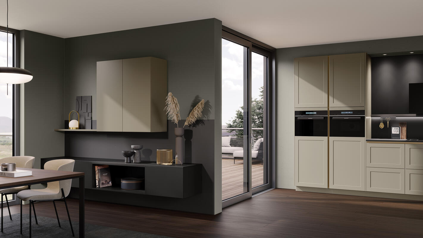 The brushed metallic recessed rails adds a luxurious element without overstatement. The glass front wall cabinets keep the space open and the addition of a sideboard and wall unit using the same colours allows the dining room and kitchen to flow.