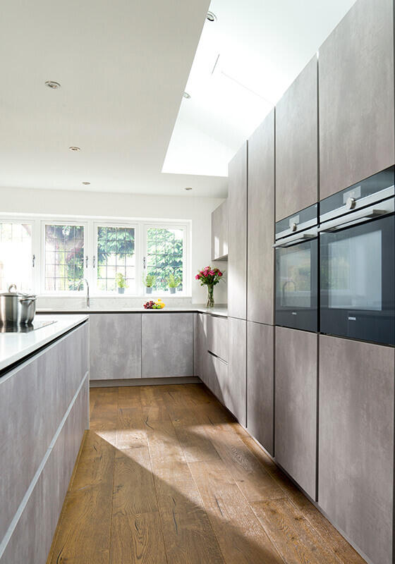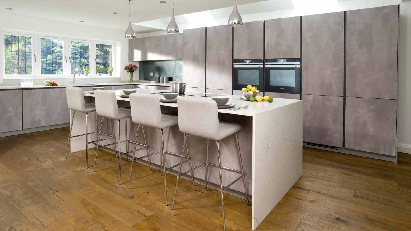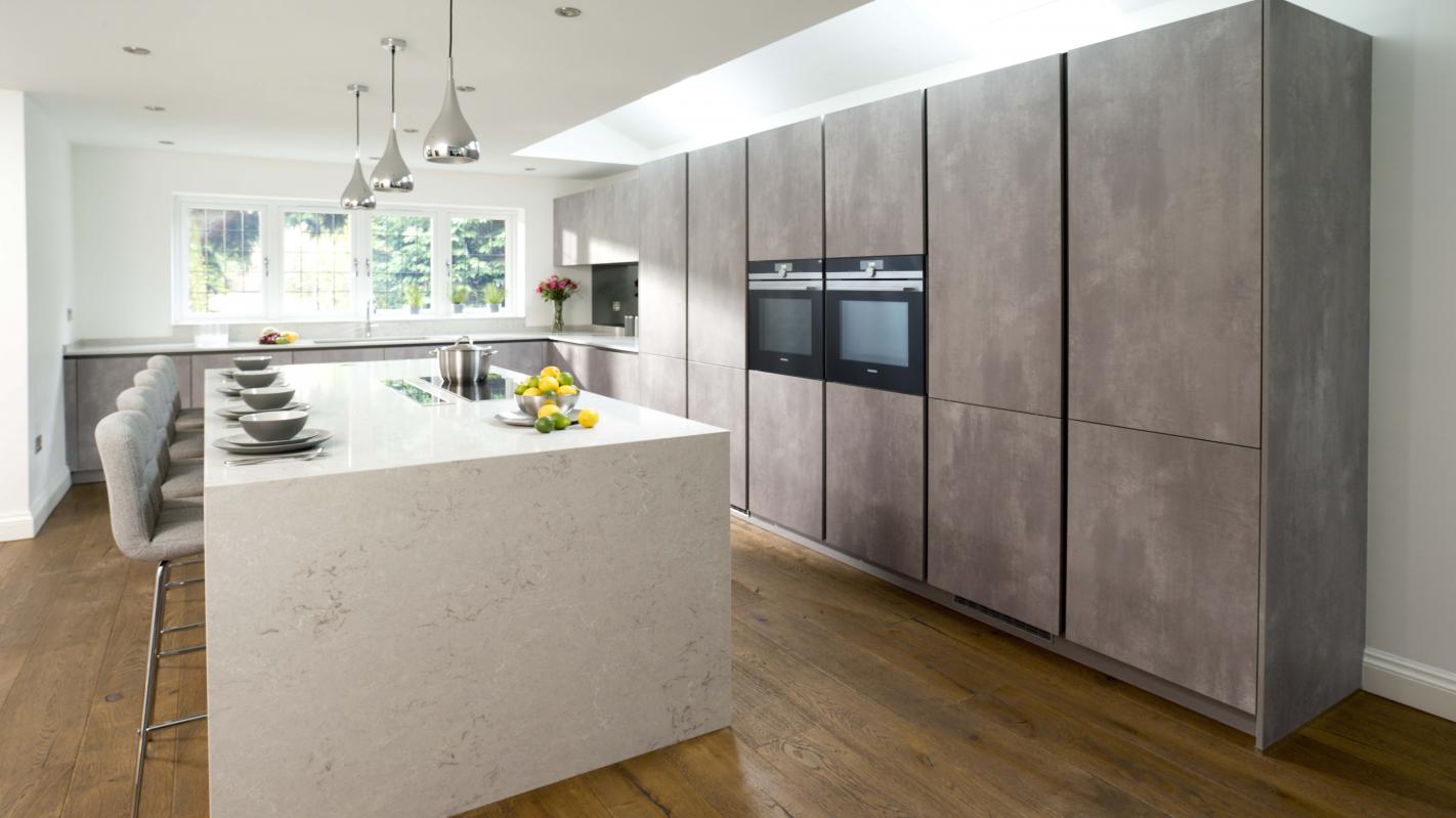 An impressive bank of tall units in the same concrete style finish also deliver an impressive amount of storage and conceal the large fridge and freezer and accomodate two Siemens ovens.