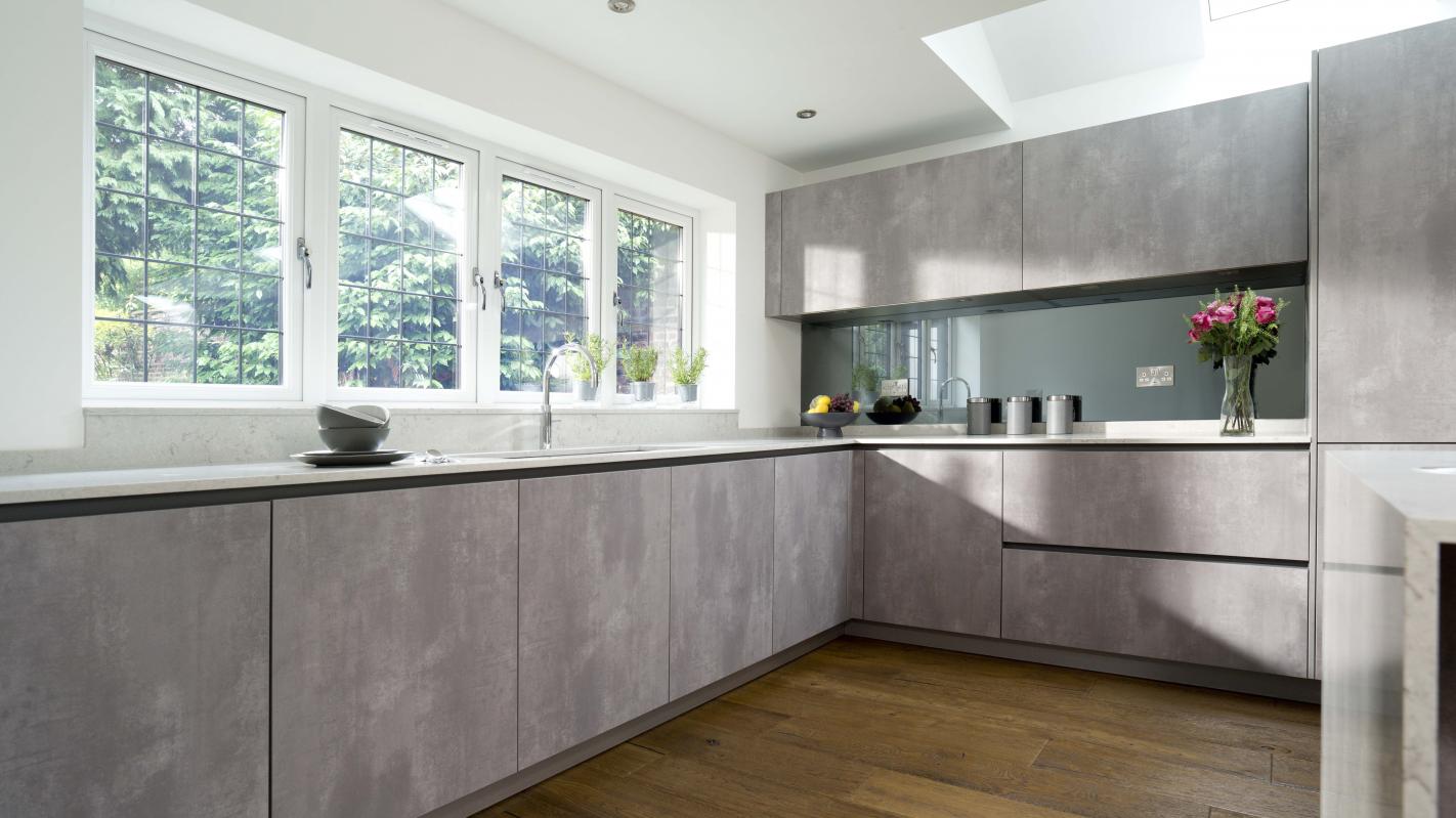 The concrete style kitchen cabinets contrast perfectly with the warm tones of the wooden floor and traditional window features of the house, creating a contemporary space within this period property.