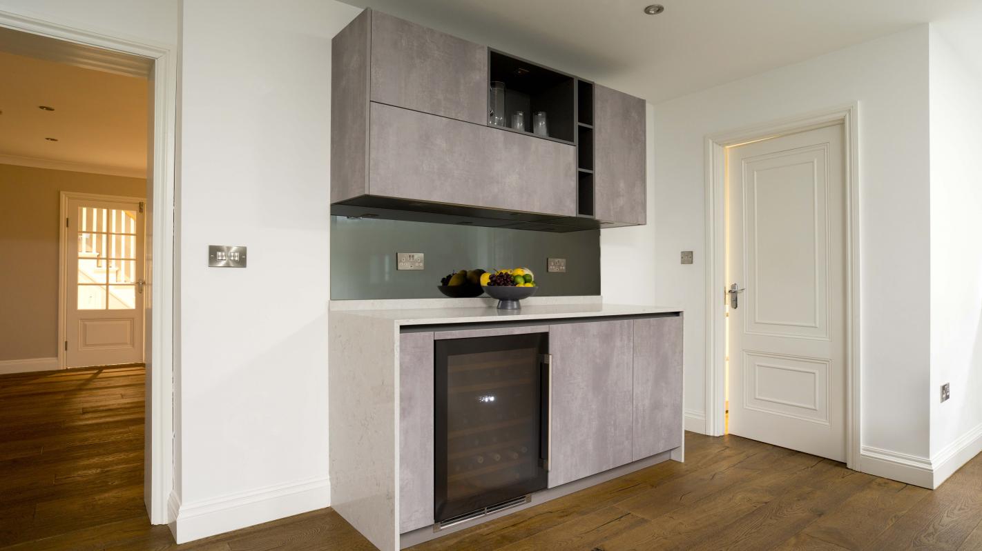 Urban Style Putty Concrete handleless tall and base units. Quartz worktop in Bianco Drift with Grey mirror backsplash.